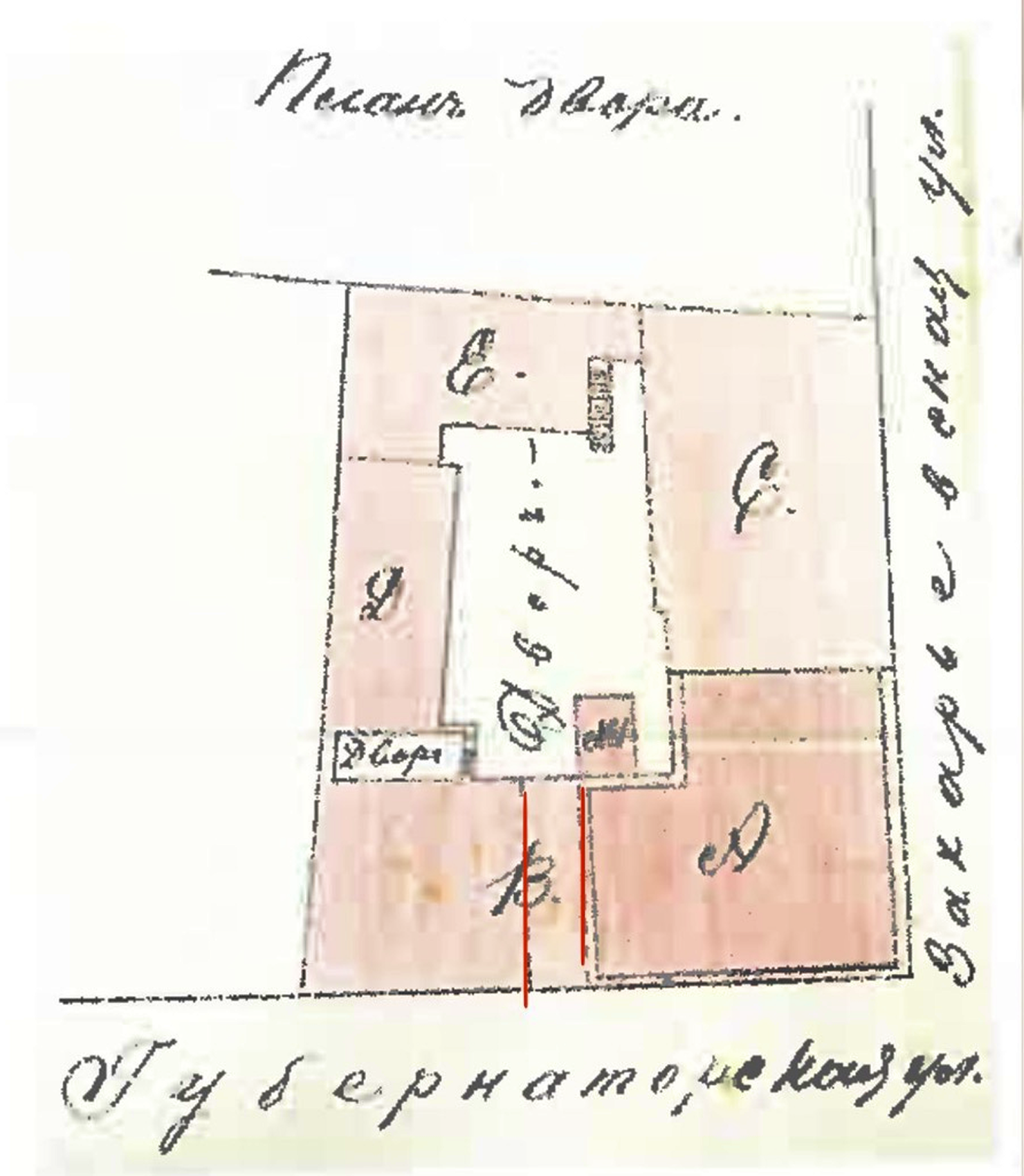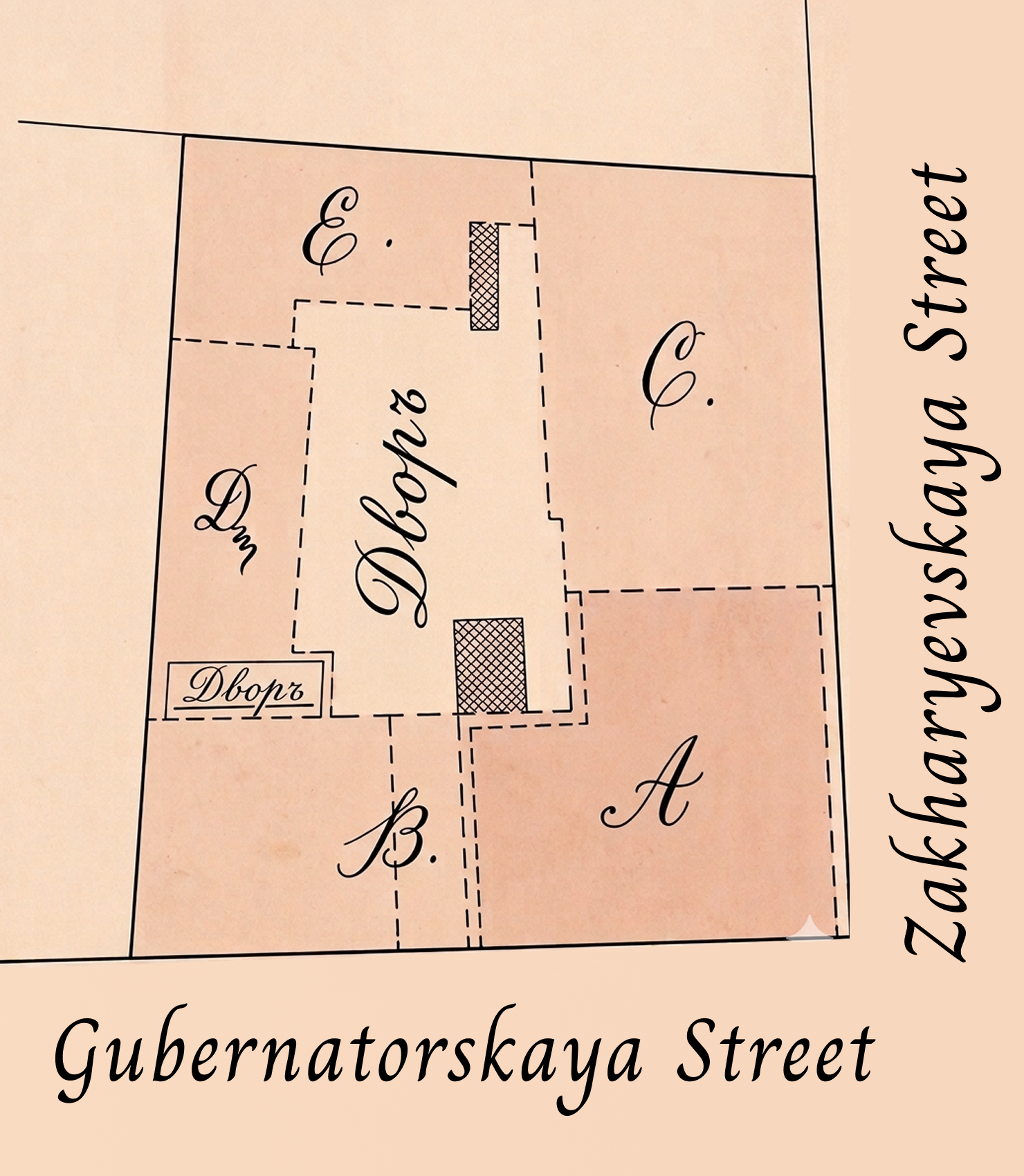 In this layout, the sign for Kaplan’s printing house was on building B, facing Gubernatorskaya. The arch is represented by a dotted line. We believe Kaplan’s printing business was in building D and that Stremer used E for his theater. Somewhere in here, by 1909, was a pharmacy in which the proprietor, Levitan, stored gasoline, presumably for the two engines.6