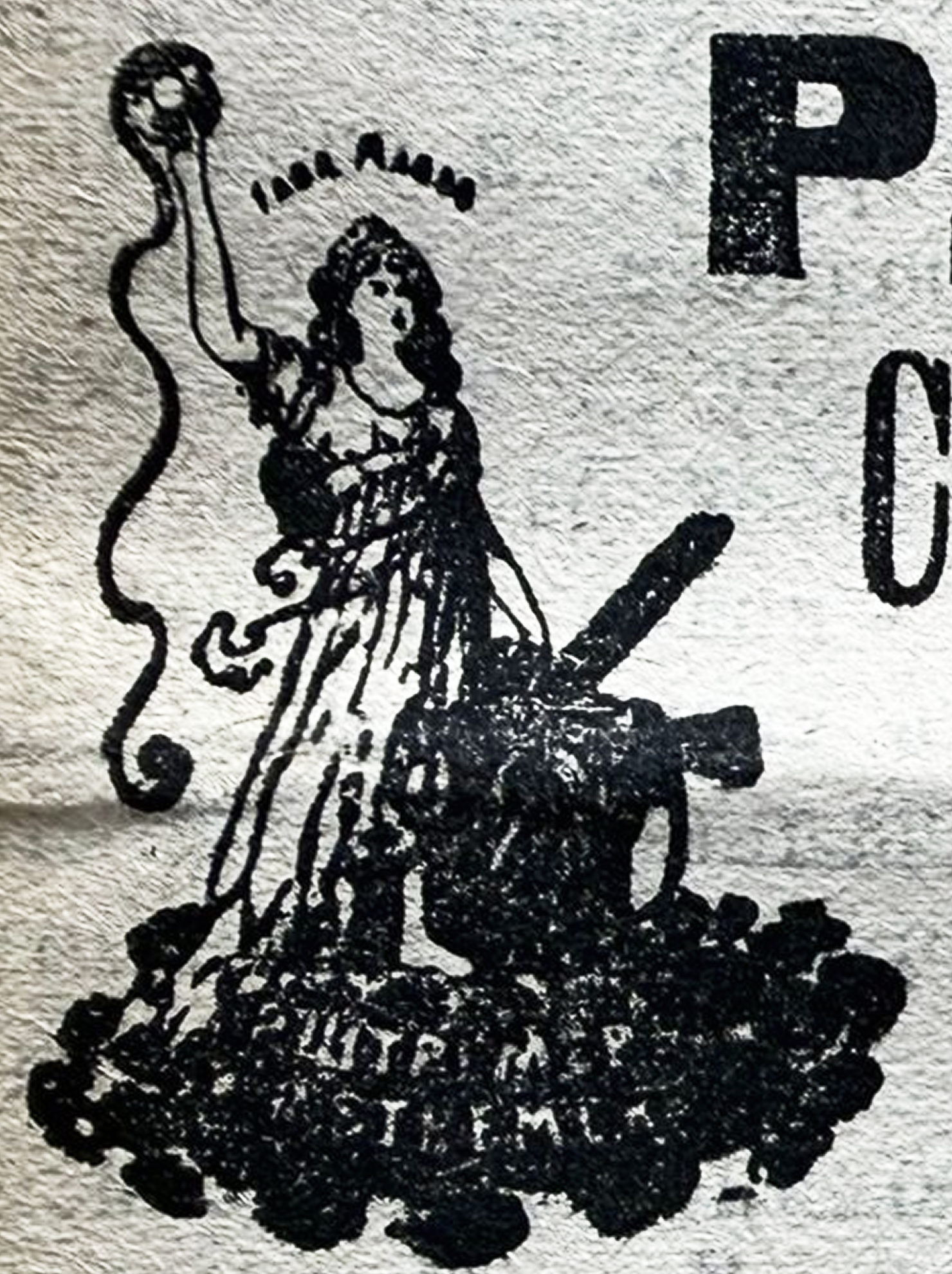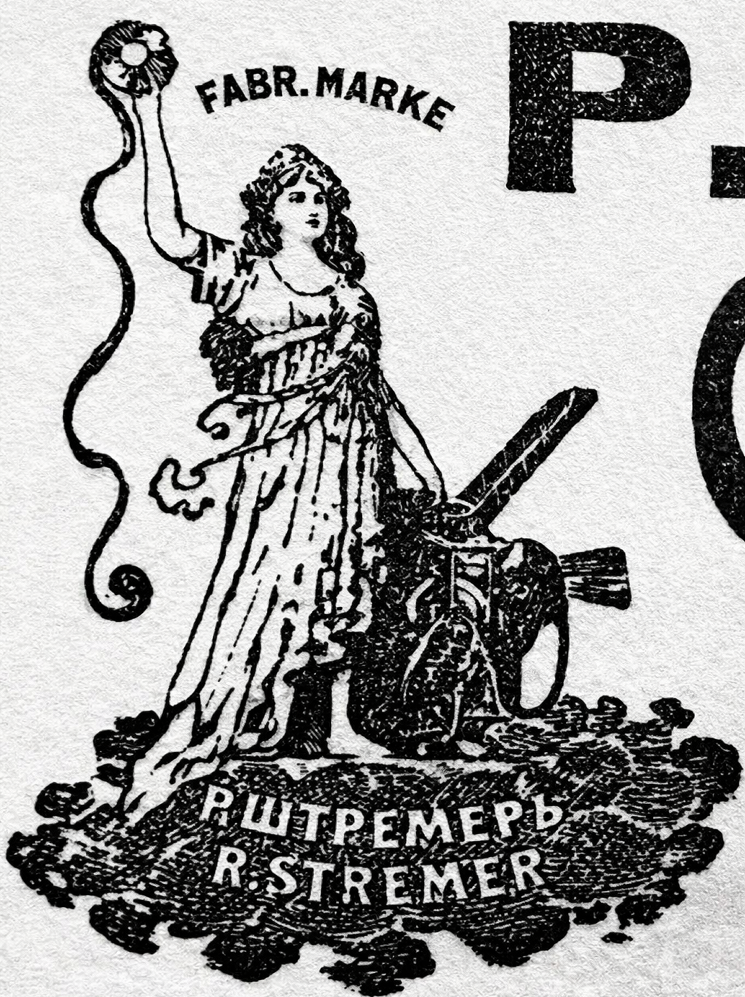 It has not been conclusively determined what the words above the figure’s head actually are because the printing on the newspaper is so poor. We believe it says Fabrique Marque, or Trade Mark.