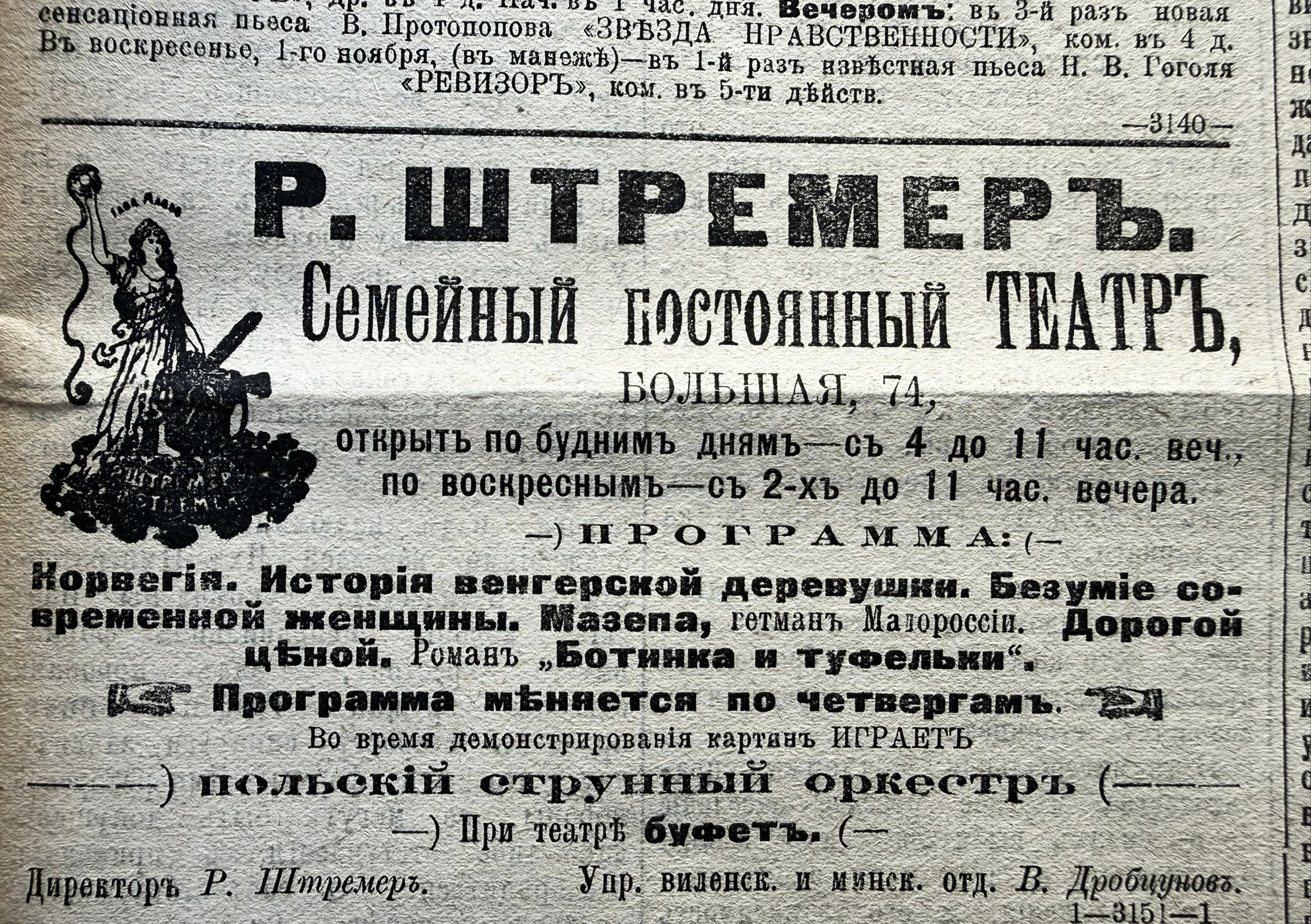 As we noted in a previous article Stremer had theater locations throughout the Russian Empire (see here). When he opened a “permanent theater” in Minsk in 1907 at the commercial building known as Rakovschick House, he found that the city could not provide either sufficient or consistent enough electric power for him.