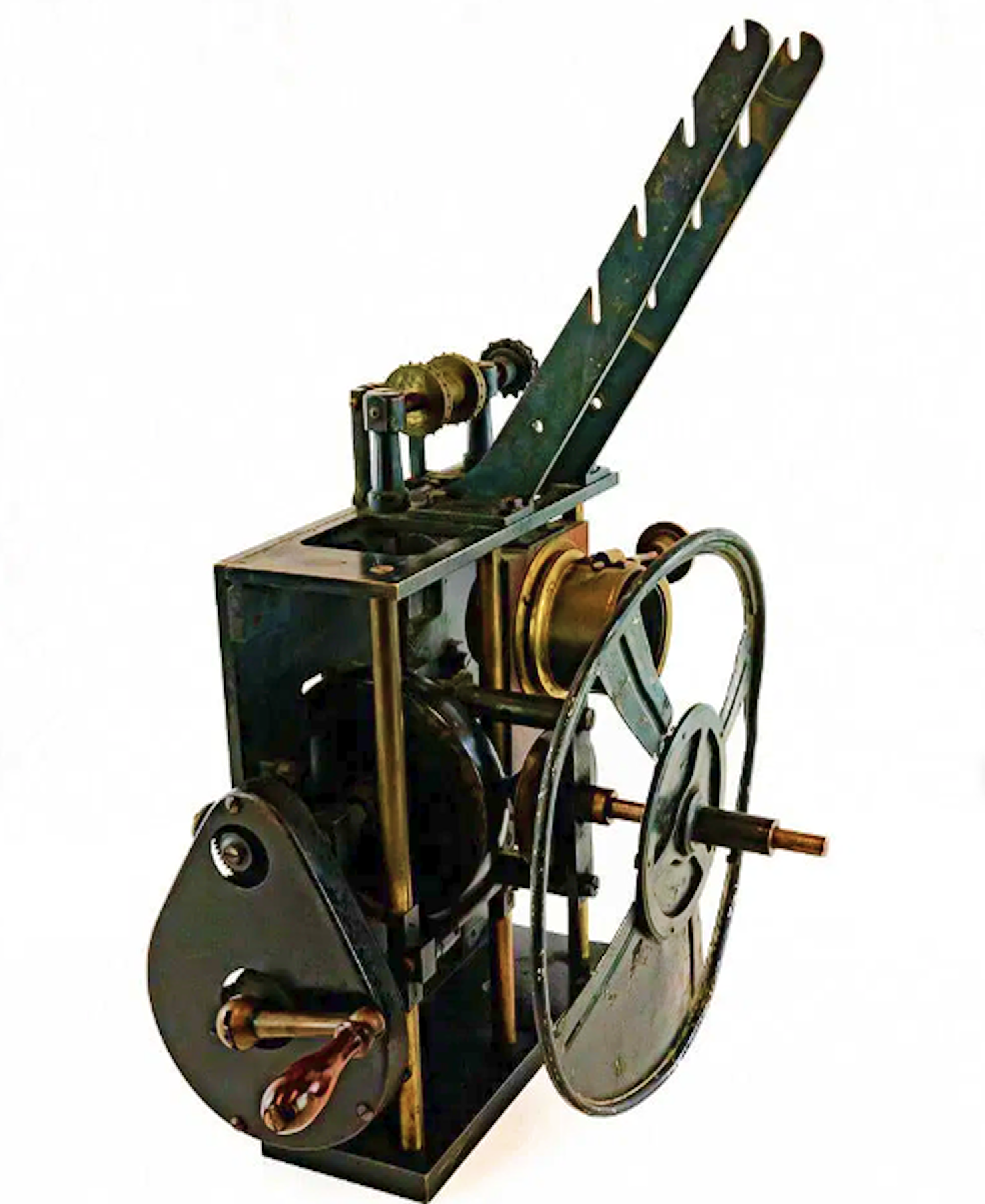 The projector in the picture appears to be a Pathe 1909 Renforce. We say that by looking at the maltese cross shutter in a ring, the film holder angling out from the top, and the thinness of the projecting box.