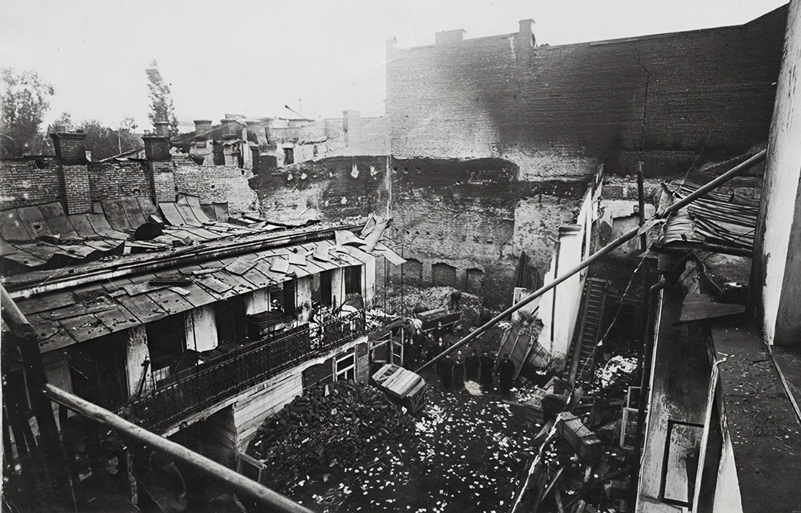 Below you can see a photo of the damage. This picture was taken from the third floor of the Rakovshcick House. That means the Kaplan Printing House is on the left, probably the building with the metal railing in front of the balcony. The building with the white wall and the external stairway could have been the location of Stremer’s theater.