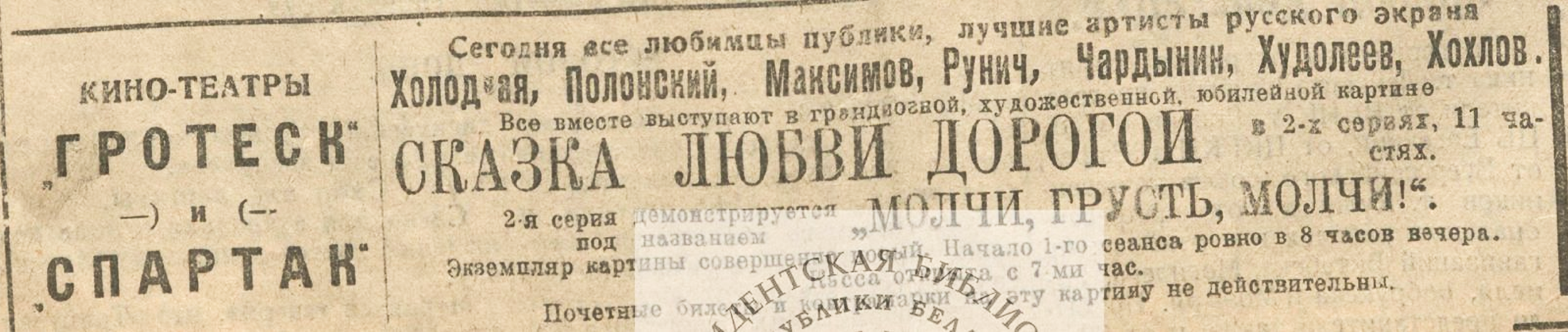 Archival documents also show that by March of 1922, the Red Army had turned it into a cinema.4 Zvezda newspaper ads for June 11, 1922, show the theaters were screening Silence, Sadness, Be Silent. (see more here).